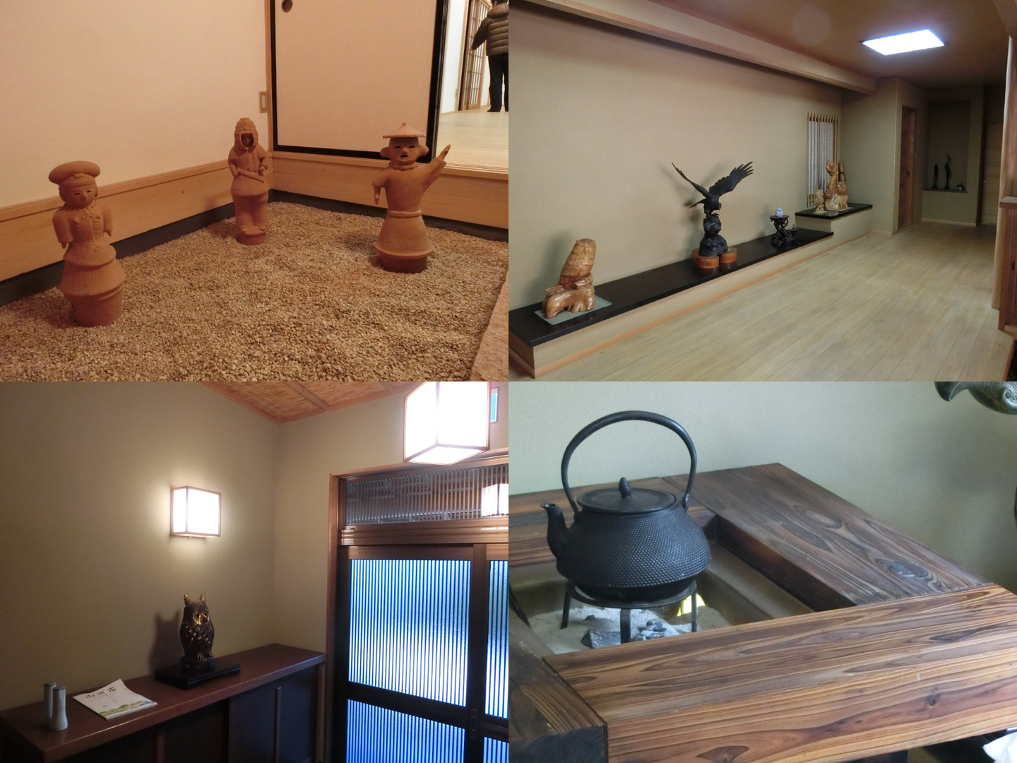 まずは気になる室内や周辺を探検。埴輪をはじめ置物まで豪華です。囲炉裏も!