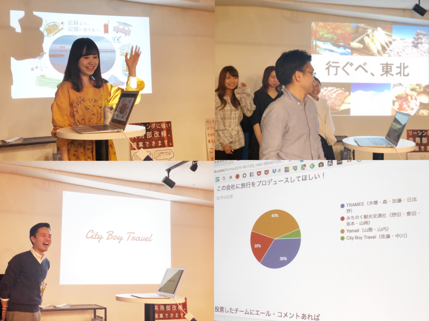 投票の結果、2月入社のフレッシュな山際と山内による「記録よりも記憶に残す旅へ」を掲げる「Yamall」が優勝!クリエイティブな2人のプレゼン資料は、どのチームよりも美しく、内容もみんながワクワクするコンテンツが目白押しでした♪