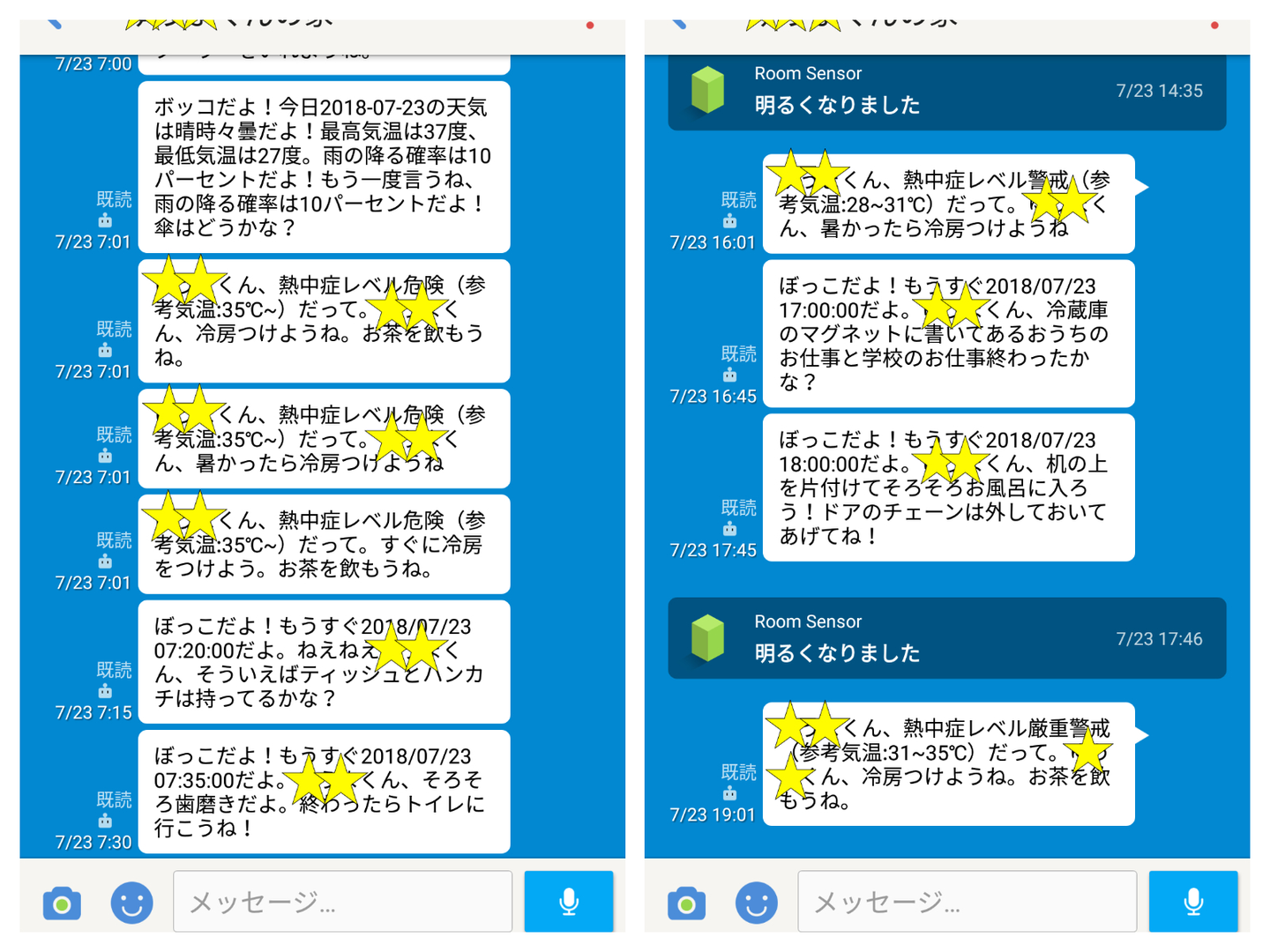 20:30 | 子 Boccoから「そろそろ寝るといいよ。眠れなかったらプラネタリウムを見るといいかも。また明日ね。おやすみなさい」(毎週土曜には、「くつ洗い、トイレ掃除、浴室掃除をしよう」とBoccoがリマインドを送ってくれます。)