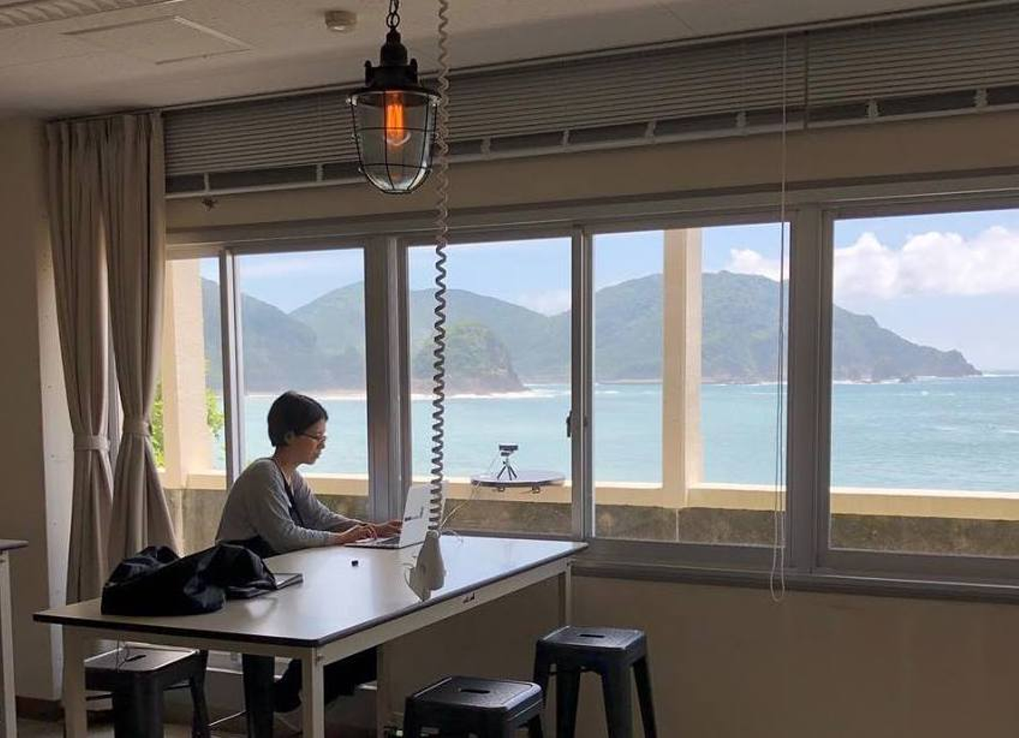 (2018.07 ヒトカラメディアがプロデュースした徳島県美波町コワーキングスペース「ミナミマリンラボ」にて。海側に出しいるカメラの映像は、渋谷のヒトカラメディアのオフィスでも流れています)
