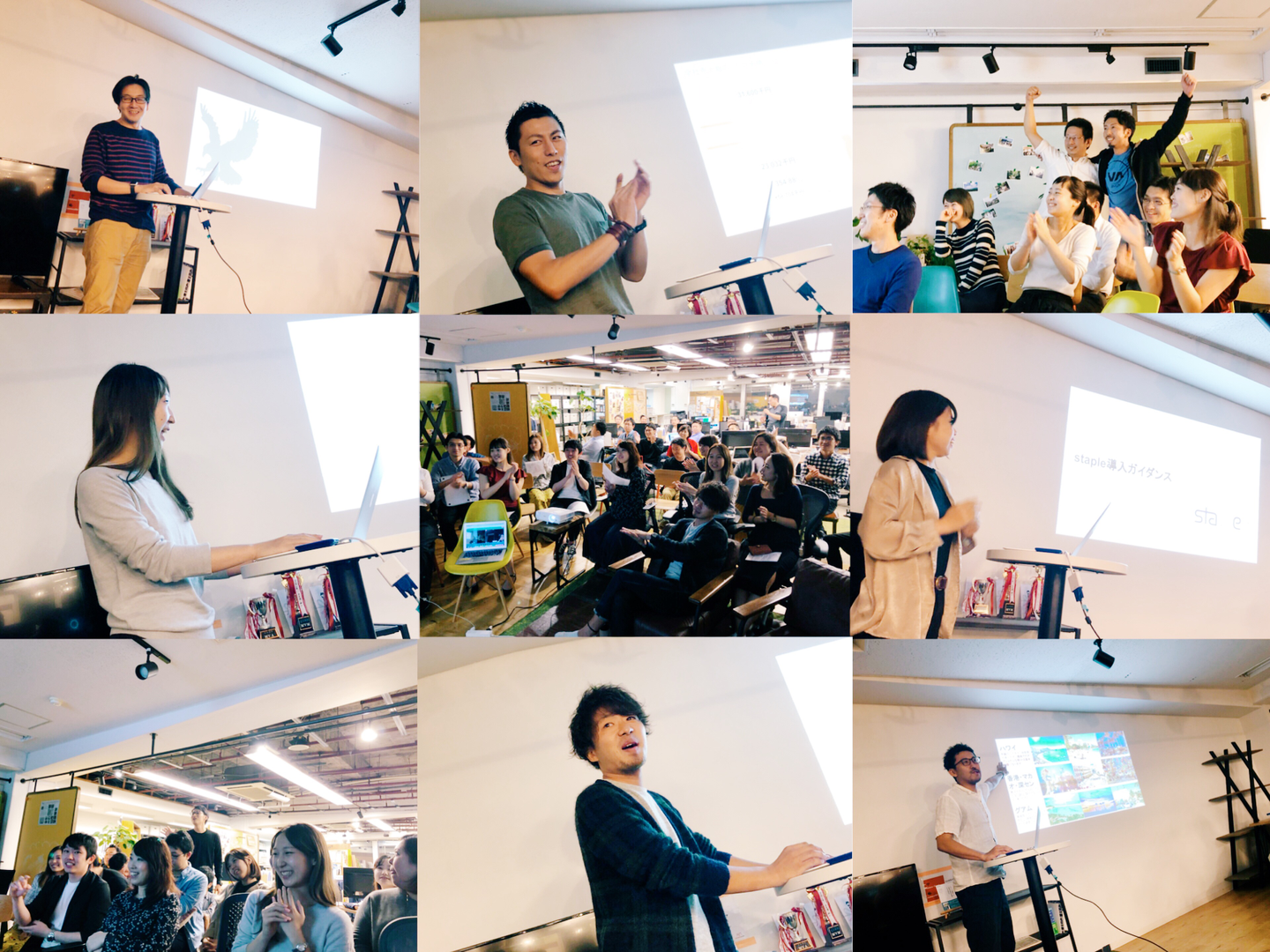 この日は、4月に入社した企画営業部・営業推進担当の工藤から「営業推進のお仕事やメンバーを知ってもらいたい!」というナイスアクションがあったり、19卒インターンの伊澤からは新しく導入を検討している社内ツールについて堂々とした発表があったり、上半期目標達成により決定したヒトカラトラベル(社員旅行)の行き先についてGoogleフォームを使ってリアルタイム投票が行われたり、新しいオフィスのレイアウト発表があったり、盛りだくさんでした!