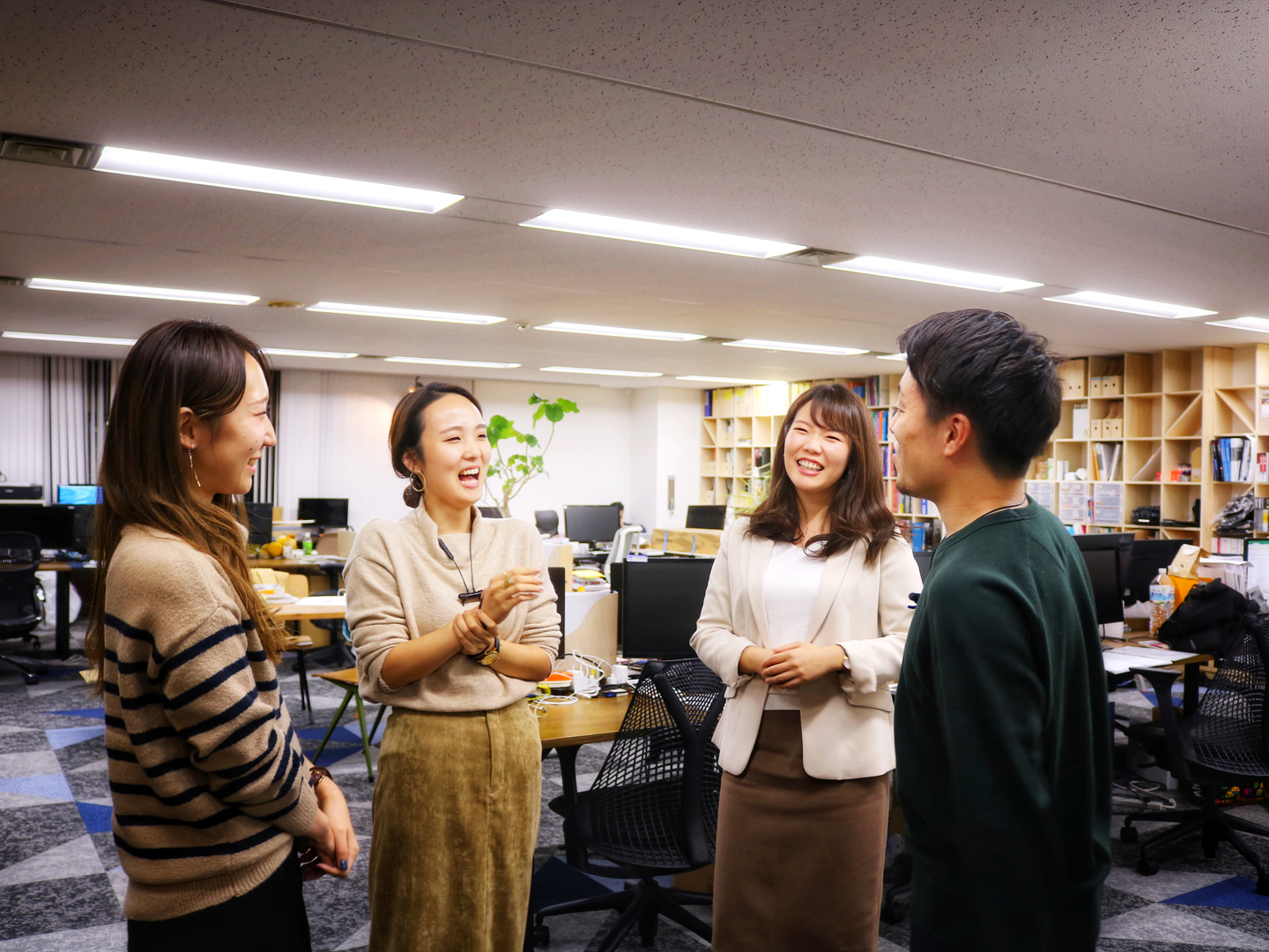 2018年10月に移転したきたオフィスは、ずばり「働き方を選べるオフィス」。執務スペース以外に「ここも働けるの?」なんて隠れた空間もあります。一緒にプロジェクトを進めているメンバーの隣に座ったり、一人で集中したいときはこもったり、一日の間に移動している人もチラホラ!中にはキッチンでお仕事している人の姿も!