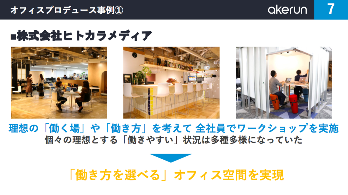 ヒトカラメディアでは、働き方の変化や多様なニーズを柔軟に捉えた"その企業らしい"オフィス創りが、企業価値にも繋がると考えています。その上で、セキュリティもとっても大事!オフィス創りのプロとして、「Akerun」の利用事例や便利なところをお話させていただきました。