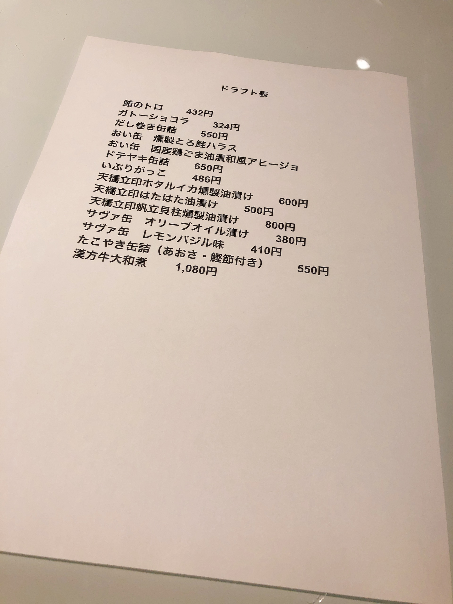 ただの食べ比べだけじゃもったいない、せっかくだからもう一捻り。。!ということで、缶詰の名前と値段を記載した表を用意。
