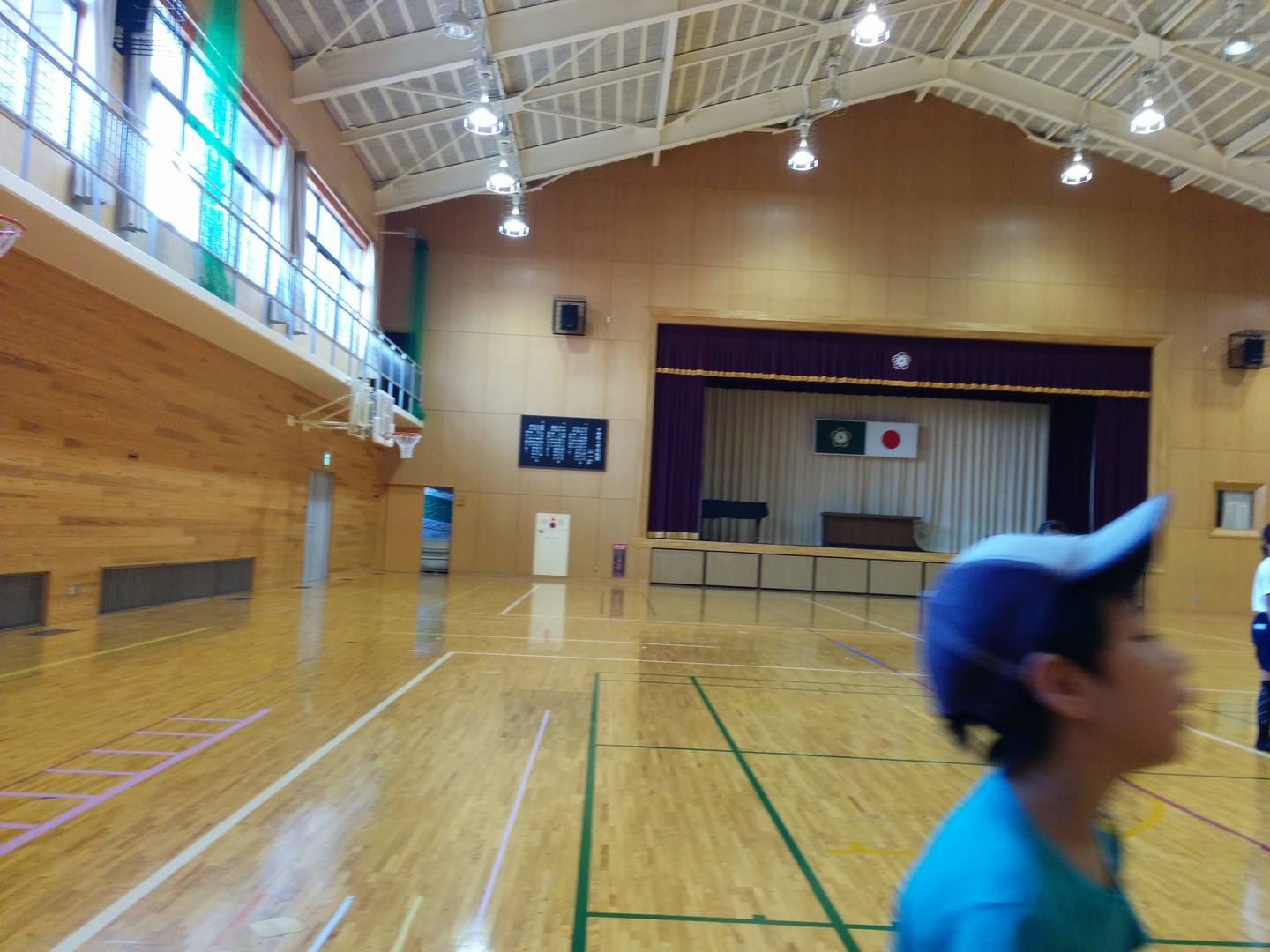 (2016.8 日和佐小学校の体育館。バスケットコートの外側が3メートルぐらい。コートとコートの間が5メートル程度間隔がありました。)