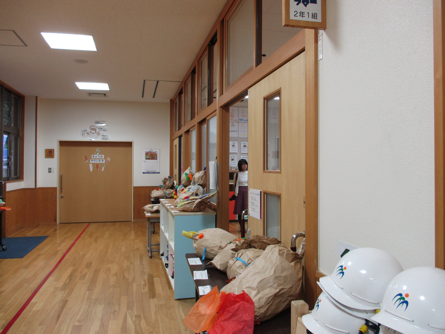 先生方もおおらかで優しい。美波町は海抜が低く海に面しているため、防災意識がとても高いです。廊下に人数分のヘルメットが並んでいました。