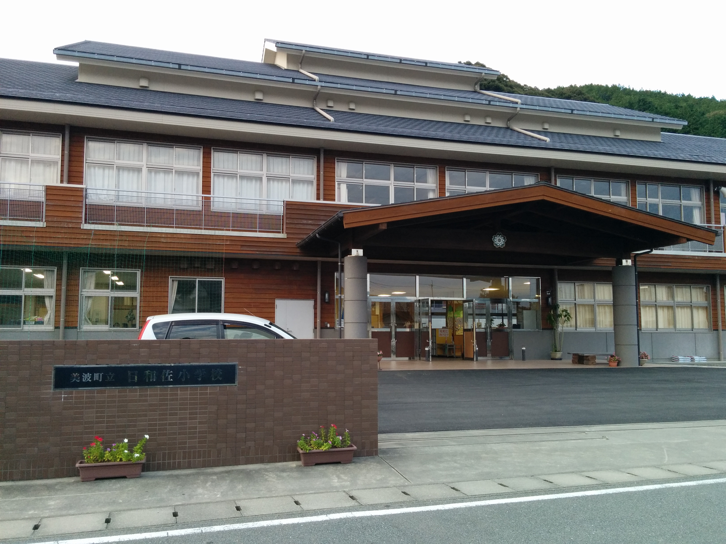 美波町立日和佐小学校(戎邸から徒歩6分)。1学年1クラス20人前後。改築された木造の2階建て校舎。プールも体育館も運動場も広い!