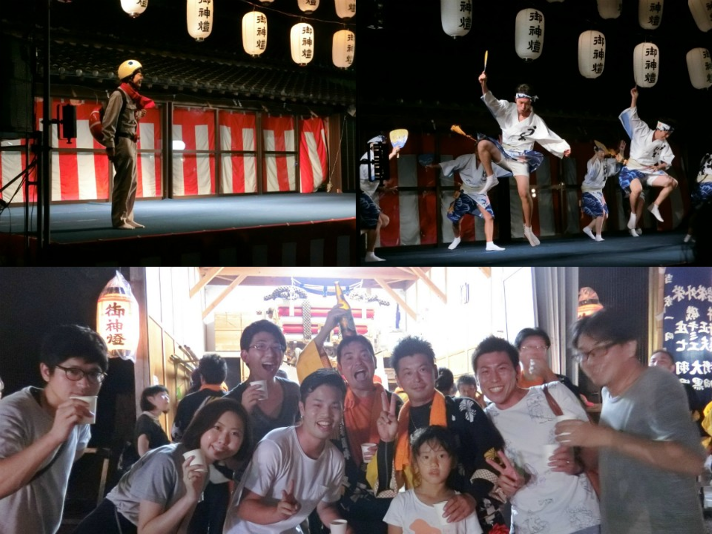 境内では、阿波踊りなどの奉納演芸や子供相撲や花火を楽しみました。また、ヒトカラメンバーが参加させていただく戎町の皆さんにもご挨拶をさせていただきました。お会いするのは1年ぶりの皆様とひたすら乾杯。みんな顔が真っ赤です・・!