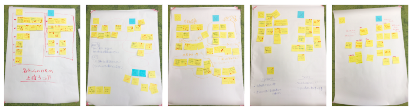後半は、みんなで久しぶりのワークショップ!オフィス移転して、「この半年で出来てきたこと」と「もう少しうまくできそうなこと」を各自で書き出して、チームごとに壁の模造紙に貼り出しました。共感できるものには、赤いシールを貼り付けていきます。最後に、チーム内で振り返りとこれからをまとめて、全体に共有しました。