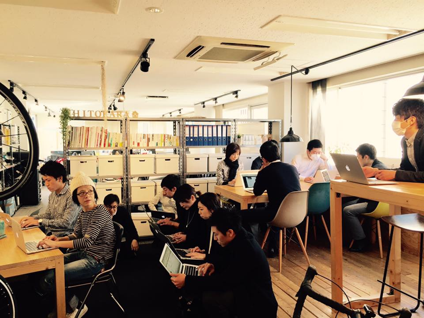 ↑ 2016年11月30日の朝礼の様子。向こう半分は執務スペースだったので、この打ち合わせスペースに毎朝20人前後が超ギュウギュウに集まっていました。(一番手前で地べたに座っているのが代表の高井です)(だれか、席を譲って・・!)