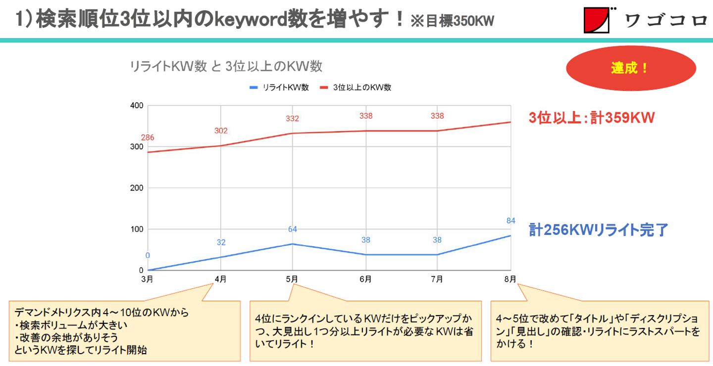 「検索順位3位以内のキーワード数、目標350キーワード!(半期)」を目標に、メンバーで役割分担をし、こまめに擦り合わせを行いながら記事のリライトに注力しました。その結果、8月末時点で「検索順位3位以上のキーワード数、計359キーワード」と、目標を達成することができました!