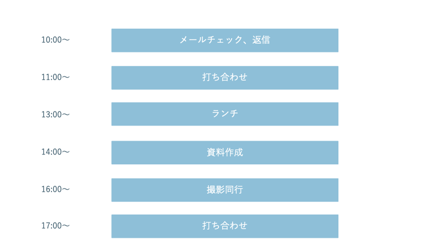 鈴木:10時に出社をして、諸々メール返信などを行い、1時間くらい経って、11時くらいから打ち合わせが入り始めて、13時台にランチに行きます。帰社後、提案資料の作成と打ち合わせです。打ち合わせは1日に平均2~3本ほど打ち合わせがあります。