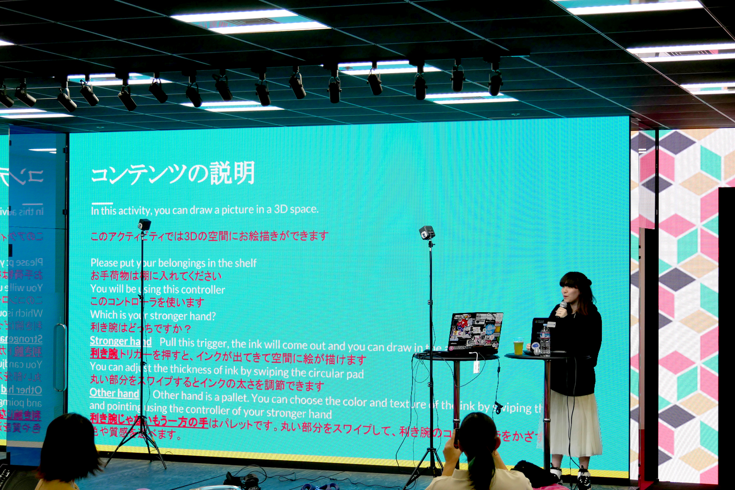 せきぐちあいみさんの描いた作品をVRでみれるだけでなく、自分でもVRでのお絵かきを体験できる機会となりました。ちょうど彼女が最近テレビ出演したこともあり、それを見た小学生の女の子が「わたしも描いてみたい!」と言って今回母親と一緒に参加いただいた方もいらっしゃいました。(ロケーションベースVR協会によるVRコンテンツのご利用年齢に関するガイドラインに従い、小学生でも限定的に体験が可能です)