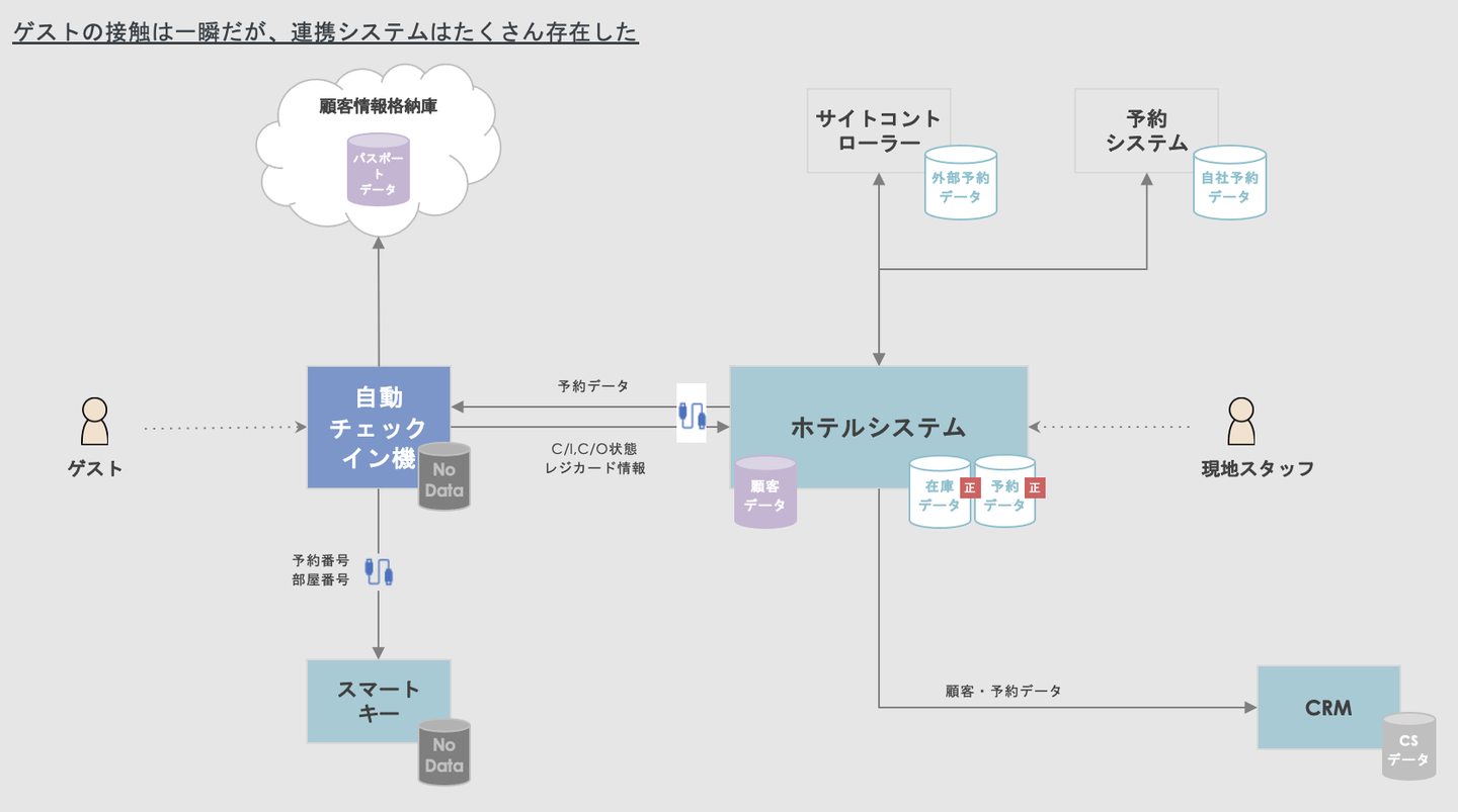 でもいざはじめて見るととても難解で。ゲストが自動チェックイン機に触れる機会はとても短いのですが、その裏では自社の予約システム、会計システム、ホテルシステムと様々なシステムと連携していました。
