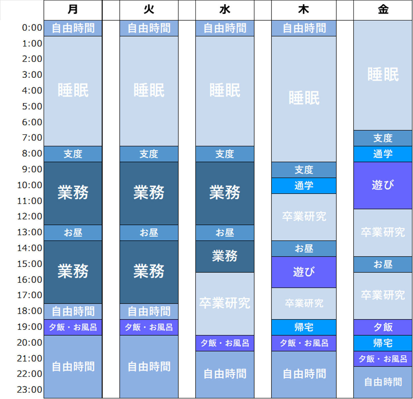 私の1週間のスケジュールは以下のような感じです。12月の とある1週間を参考にしました。