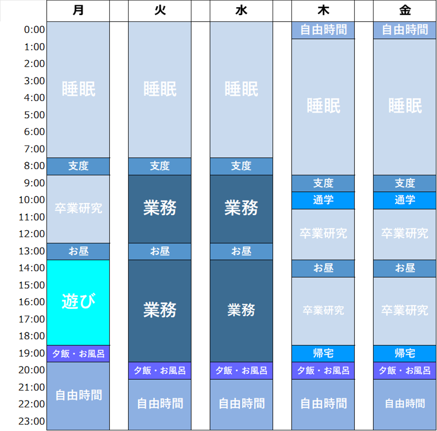私もこのスケジュールの通りで、インターン生としての業務、学業、友人との交流のバランスはしっかりとれています。