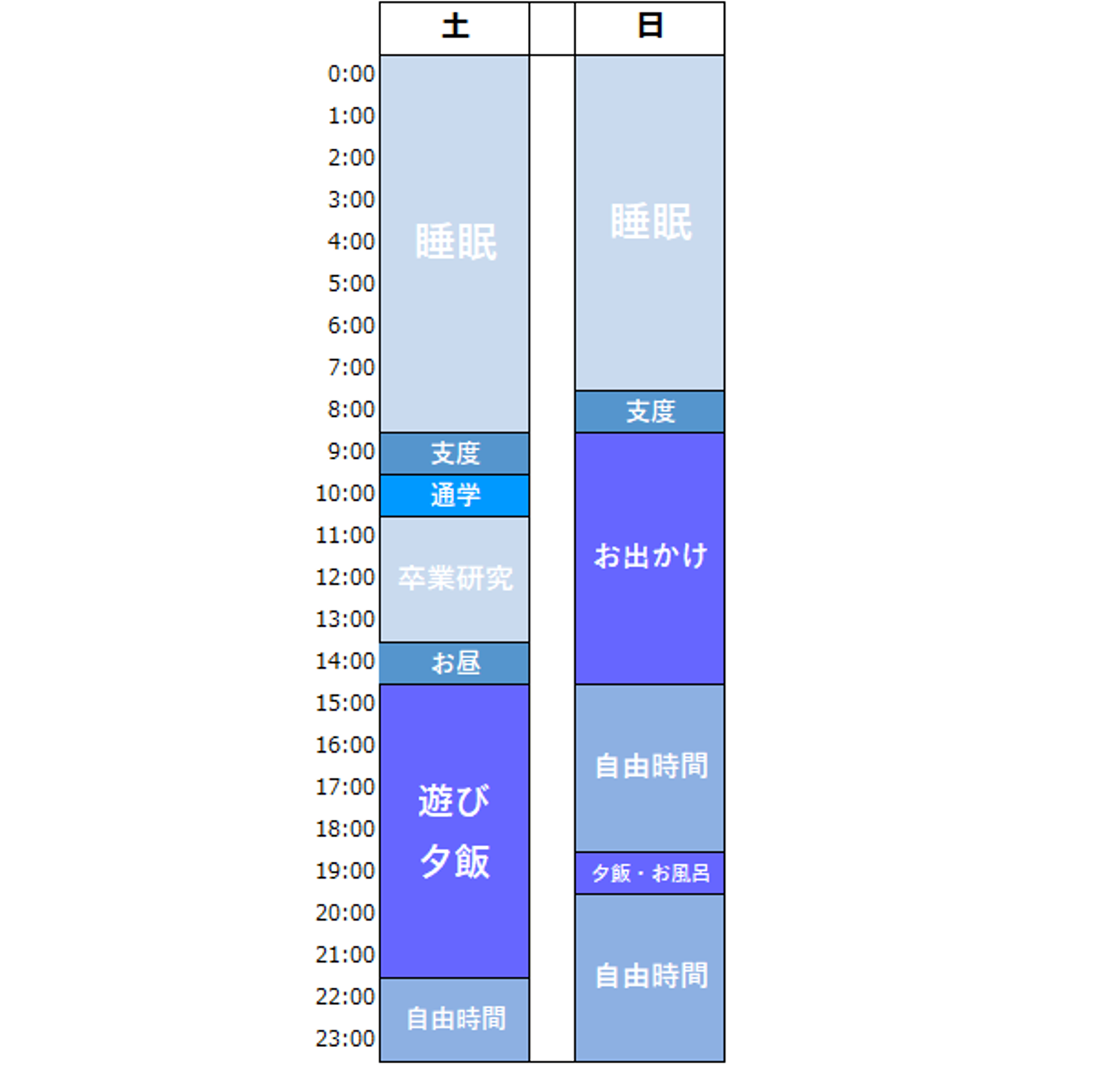 木曜日、金曜日は基本的には大学に行って、卒業研究をしています。時々友人の卒業研究の実験の手伝いなどもしています。大学付近には飲食店や遊べる場所も多く、時間に余裕がある時は、友人と遊びに行ったりしています。例にあげている週だと、ダーツと映画鑑賞をしています。たしか「呪術廻戦」を見に行きましたね(笑)