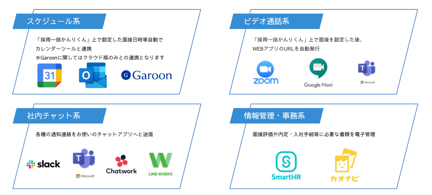 面接担当者の空いているカレンダーの枠をリアルタイムに共有することができ、応募者が面接枠を予約すると自動的に、「採用一括かんりくん」と「社内カレンダー」に予約枠が自動で抑えられ、「Zoom」などの面接用のURLも自動で発行、応募者や面接官に自動で共有されます。応募者には共有用のURLを送付するだけですので大幅に工数削減ができます。