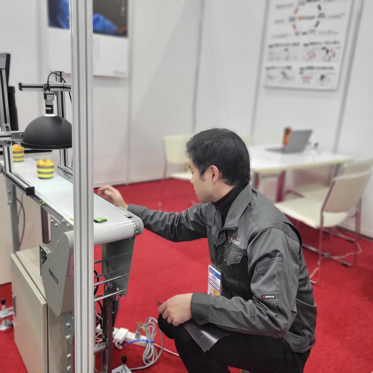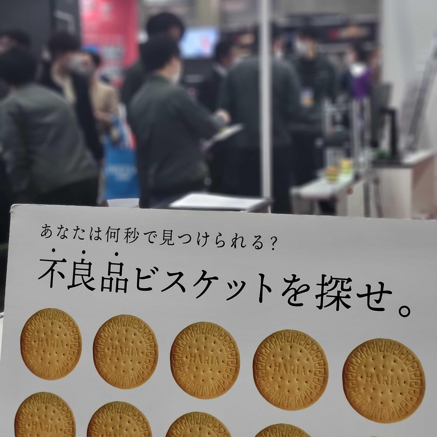 フツパーでも、外観検査AI「メキキバイト」のデモ機をブースに置き、実際に食品サンプルのマフィンを良品か不良品か判定している様子を見ていただいております!(写真はデモ機の調整に余念がない大西社長)