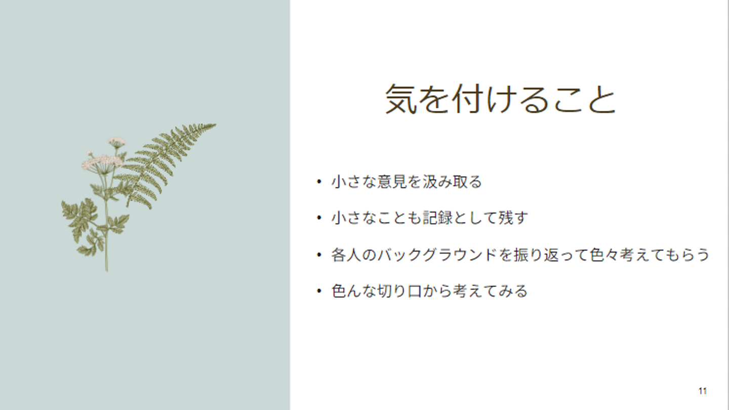 チームディスカッション後に、各チームで出たアイデアを共有します。どのチームでも共通して出るアイデアがある一方、それぞれのチーム独自の案もたくさんあり、チャット欄もかなり盛り上がりました!