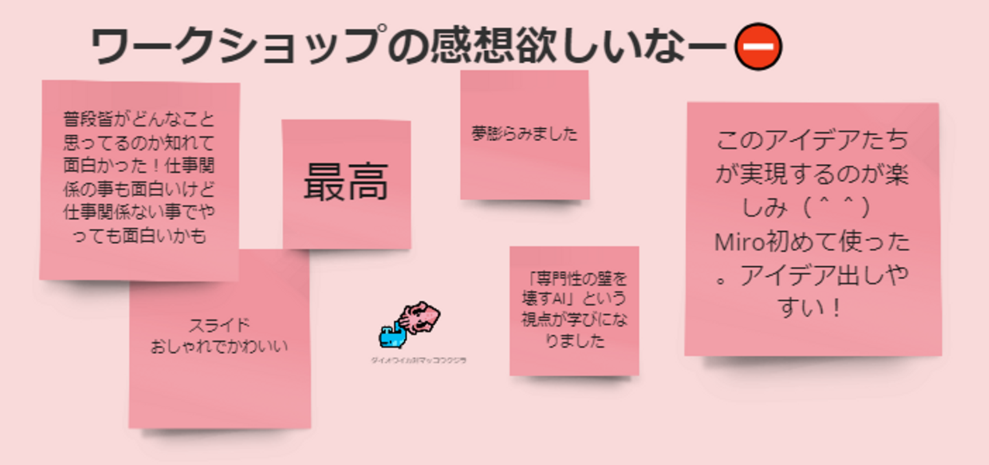 職種や部署を超え、様々なバックグラウンドを持つ社員同士が話し合うことで普段の自分では思いつかないアイデアに触れることができ、ChatGPT会と同様に終わった後も議論が白熱するくらい刺激的な会となりました。