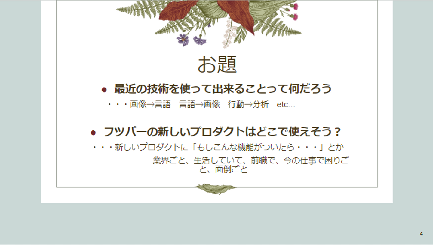 良い案を出すには、良い情報が必要!ということで、今回のワークショップでは社長から直々に、世の中の技術、フツパーの技術、生成AIがどのような影響を与えるのかなどの説明が行われました。