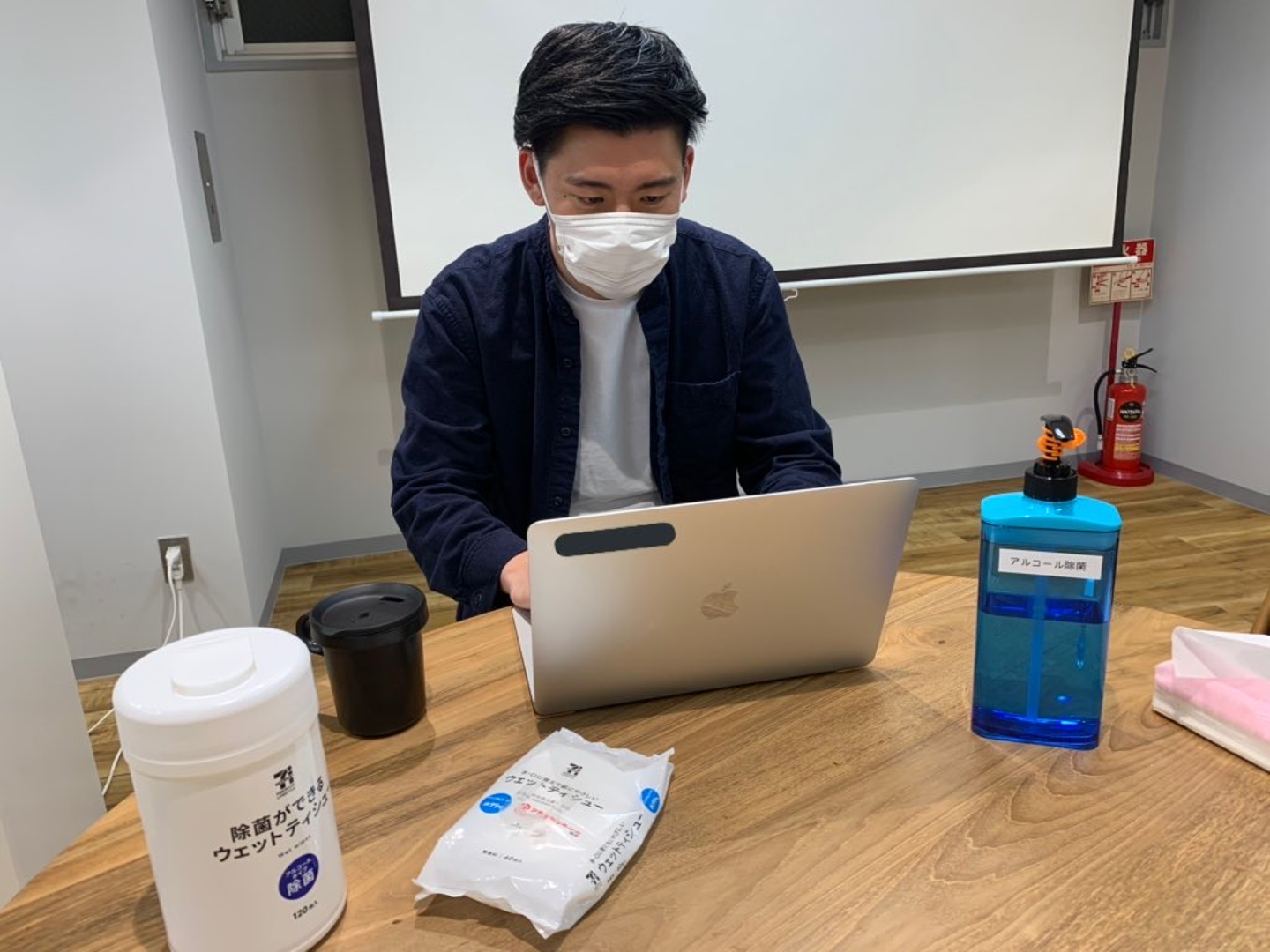出勤時にはアルコール除菌して、デスクやPCもなども除菌シートできれいにしてから作業するなどで