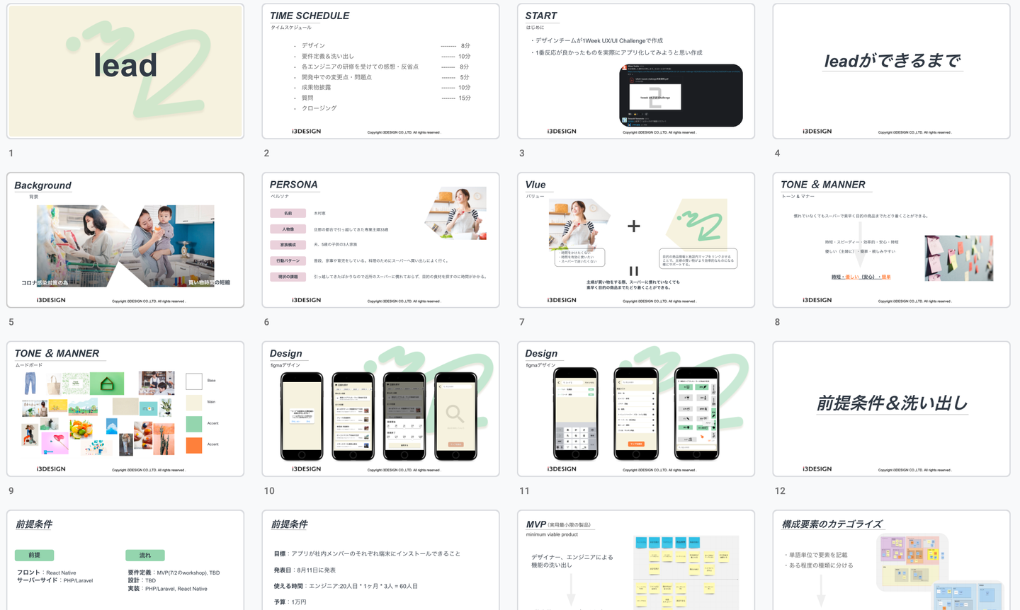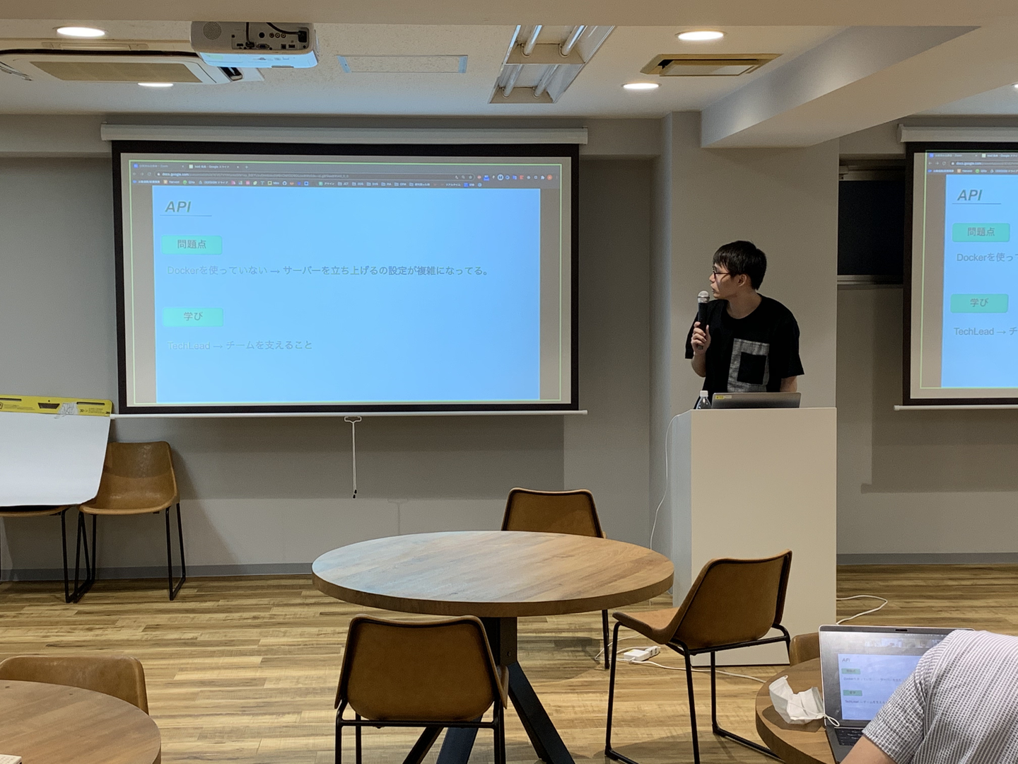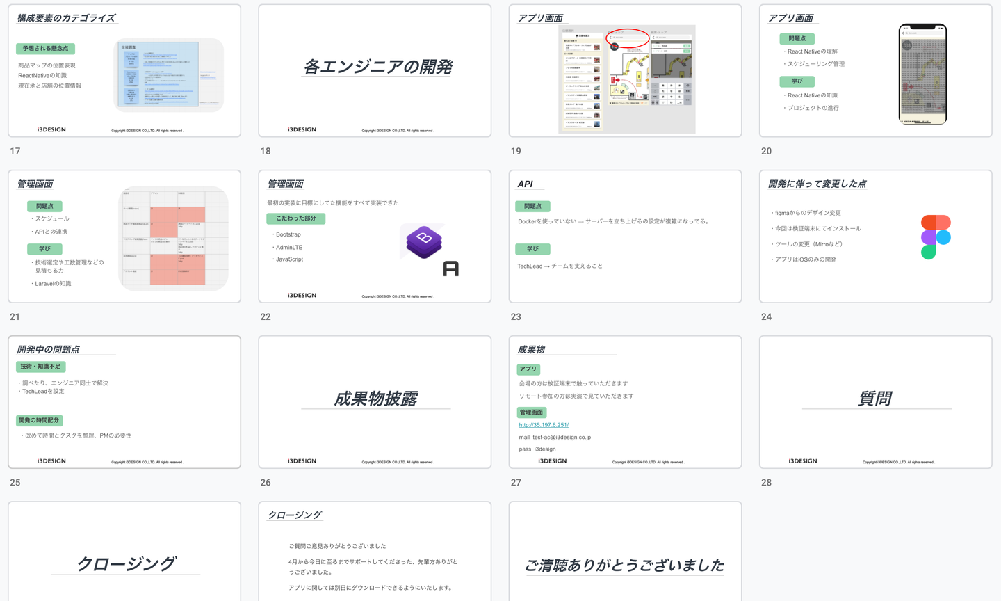 次にエンジニアより今回のアプリ開発をしていくに当たっての言語の選定、MVP、構成要素のカテゴライズ、そして担当毎の開発での学びと課題を発表してもらいました。