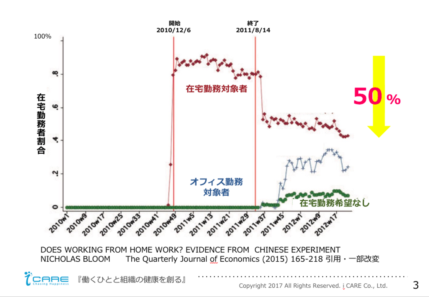 実は、テレワークで本当に生産性は上がるのか、という問題を研究したアメリカの研究論文があります。中国の「Ctrip」という16,000名を雇用する旅行業界のリーディングカンパニーを対象に、2010年〜2011年にかけて行った研究です。