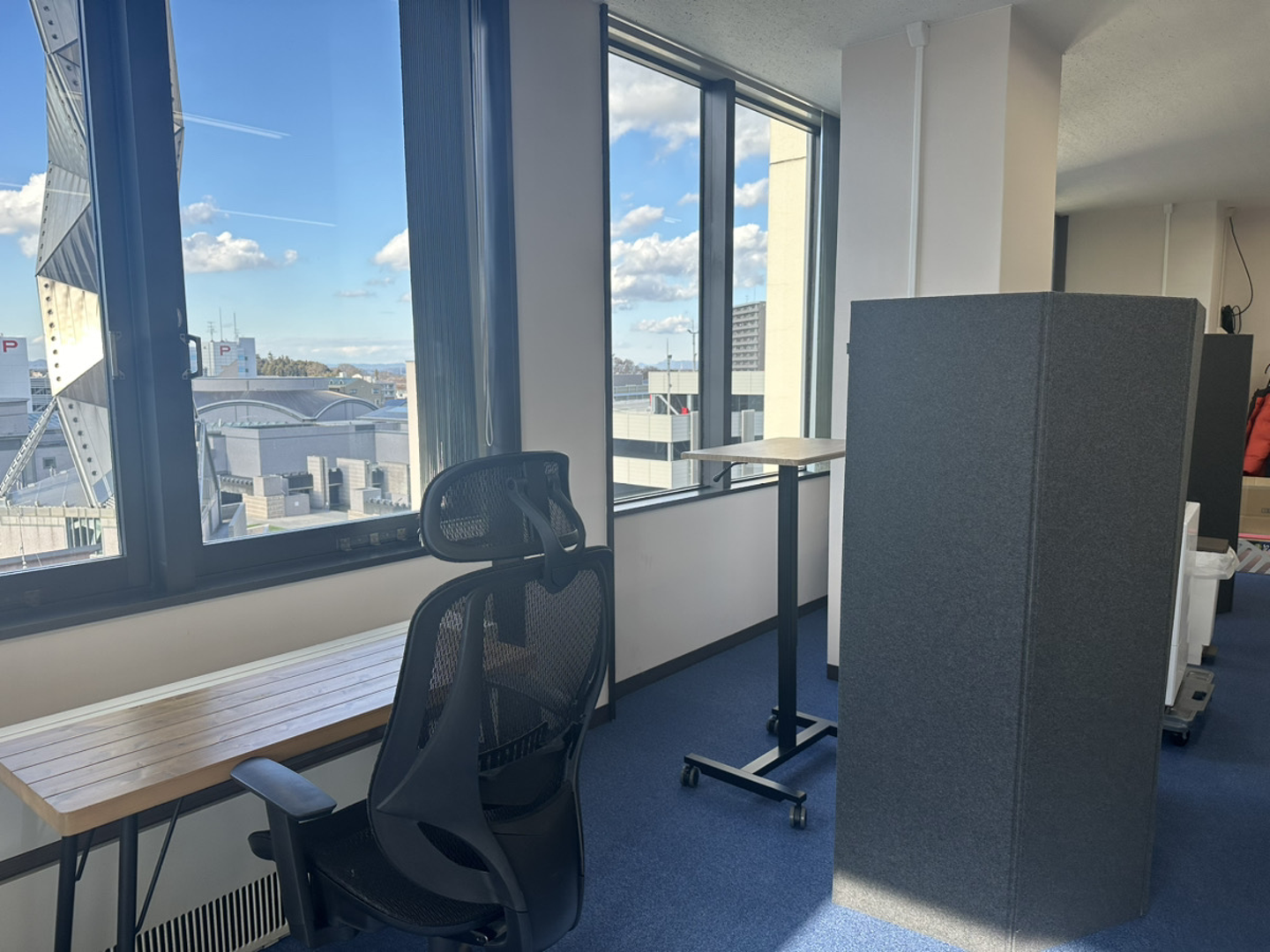 奥に写っている昇降デスクとグレーのパーテーションは自由に持ち運びができるため、