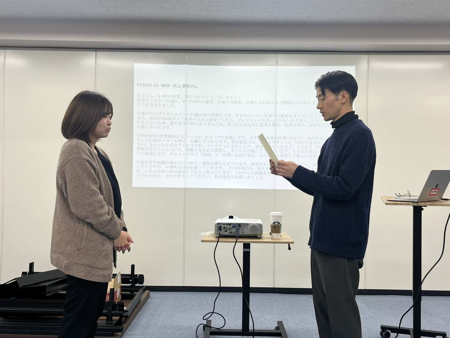 ▲キックオフでのMVP受賞風景。賞状作りするとき、色々思い出して、私にとっても良い時間。