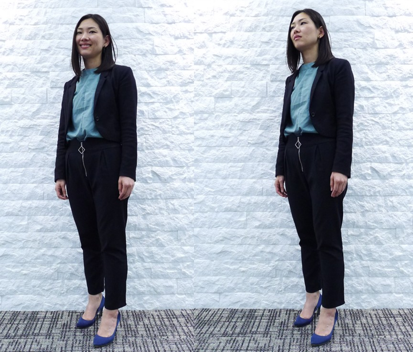 流行りのボリューム袖に、色味の違うブルーで爽やかにまとめている岡野さん。