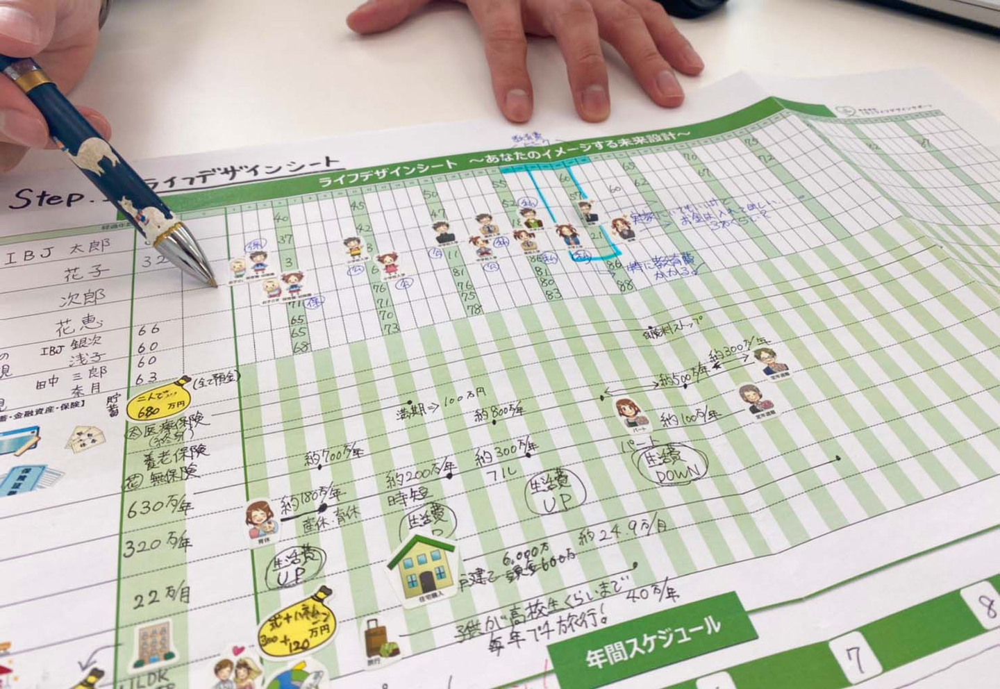 田尾:主に、IBJの結婚相談所でご成婚退会されたお客様や、真剣交際中のカップルに対して、将来設計のお手伝いと、将来に対する準備やアクション提案(保険のご提案)を行っています。1回目の面談でアイスブレイクやライフデザインシート(年表)をもとに将来のイメージを可視化。2回目は、収支グラフを用いて「収入と支出が何年目にどうなるか」という情報から「どんな準備を行っていくのか」を考えます。3回目で、私が提案できるものの中から課題解決のアクションプランを提案させていただく、というのが理想です。