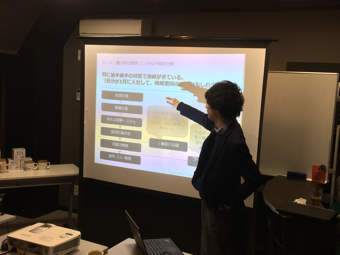 ワークスイッチは、自分の知識を磨くことも、プライベートを楽しむことも、「自分で選択できる」環境だと思います。抜擢人事例もあるため、やるかやらないか次第だと思います。本当に良い意味で「自己責任の会社」だと思っています。事実、ワークスイッチコンサルティングのカンパニー長が、「好きなことをやれ」と言ってますし、2018/3/1は部でビジコンがあり、自チームを踏まえて、自分のやりたい(企業の採用の上流過程から密接にかかわり、働く人の笑顔を増やす)ことへ繋がる、導入の提案をさせていただきました。