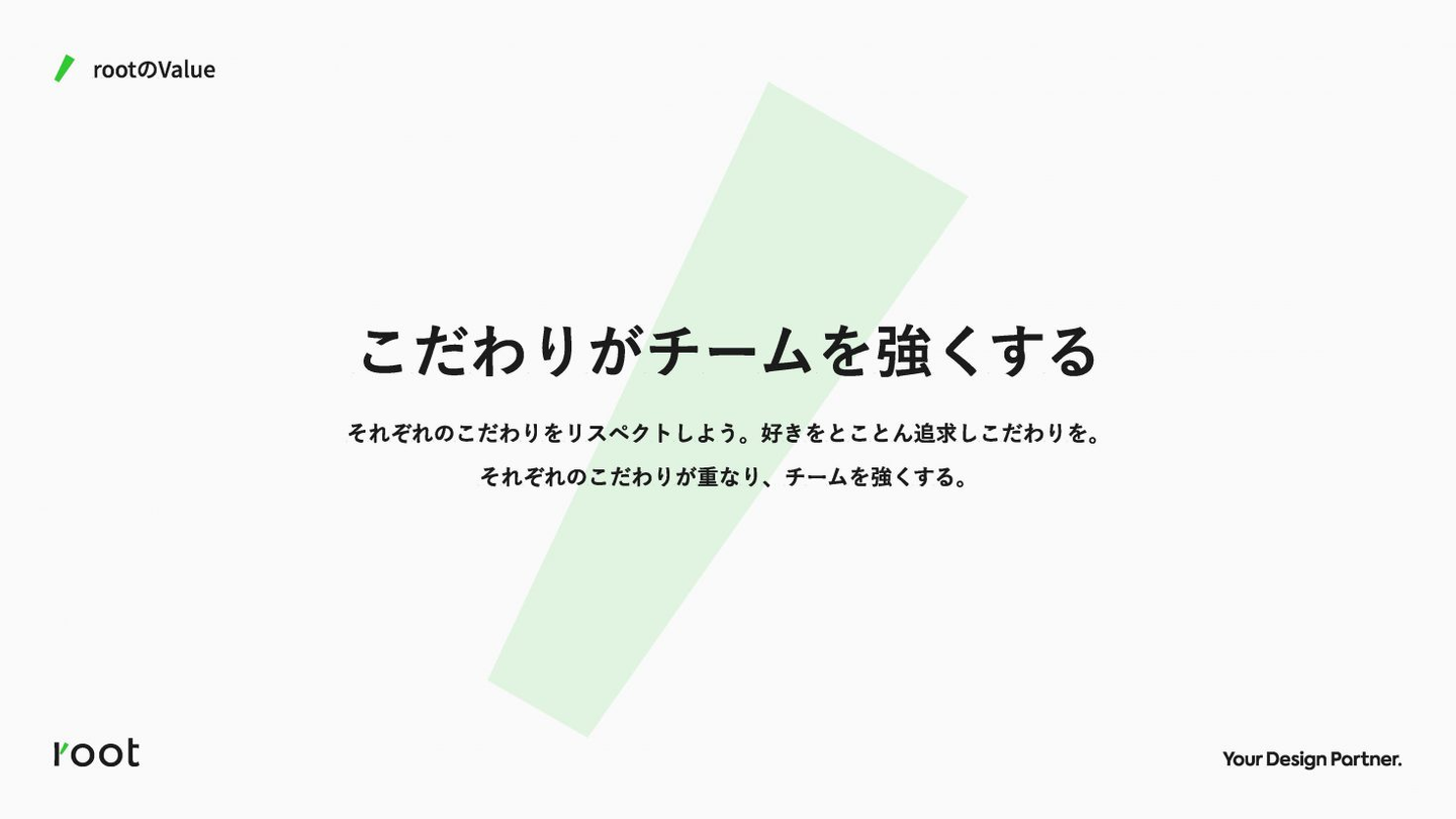 最後に、rootでは専門性の重なりを重視しています。それぞれがプライベートでも、仕事でも、こだわりを持つことを大切にしています。自分のこだわりを押し付けるのではなく、お互いのこだわりを尊重し重ねる姿勢を持つことがチームをより強くしていくと考えています。