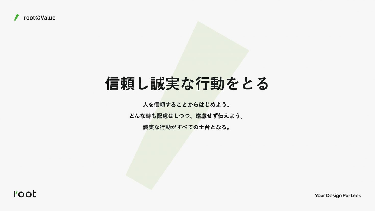 rootのバリューは価値観を示したものなので、具体的な行動を示したものではありません。根本にある価値観を明文化し共有することで、具体的なやり方や行動はできる限り各自が主体的に判断し行動していくことが理想だと考えています。