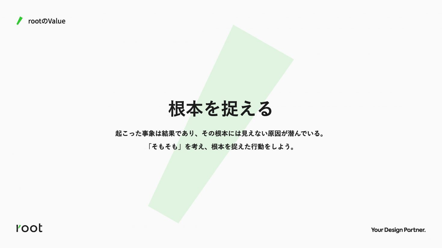 rootは、これまで以上に会社として、組織として活動していくフェーズに突入しました。これまでの取り組みを強化し、より多くのクライアントに対して、デザインを通じて事業成長を支援するために、root自体も成長しなければなりません、フィロソフィーの刷新は新たなスタートラインに立ったにすぎません。