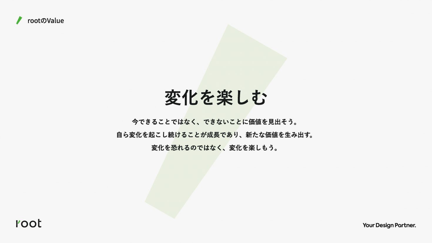 rootは、テクノロジーの領域に接続しているので、置かれている環境の変化がはやい。変化をすることは前提であり、変わり続ける環境に対して自らが能動的に行動を起こしていくことが新たな価値を生み出すと考えます。また、root自体も成長していくなかで変化していきます。rootに関わるメンバーは、変化を恐れるのではなく、変化を能動的に起こし活動していくことにより、変化を楽しめるような姿勢を持つことが欠かせません。