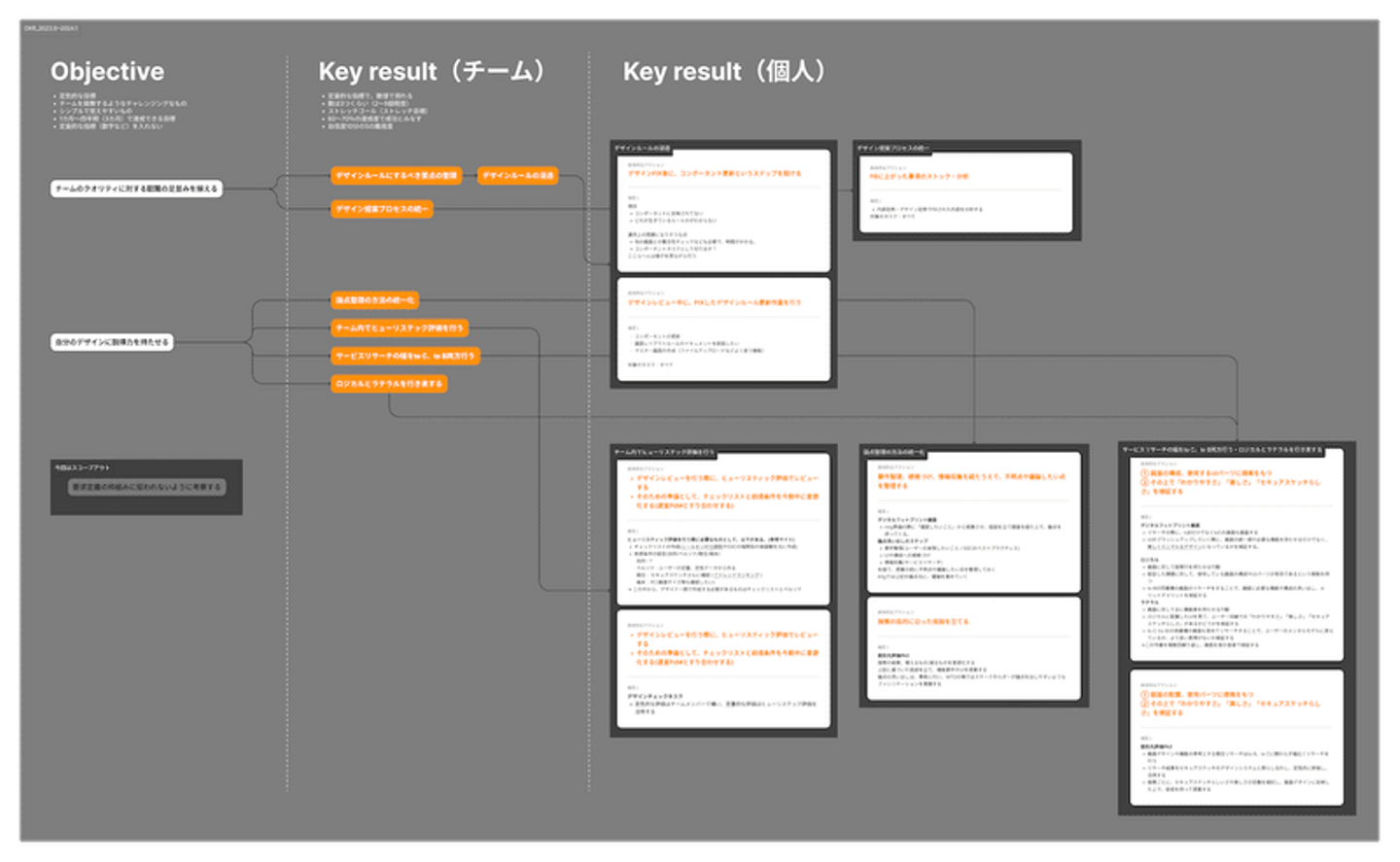 他社サービスとの圧倒的な違いのある体験を生み出す上で、チームの力を底上げするため、OKRによる目標管理を行った。いち施策に目を向けた検討ではなく、一貫した体験を意識した企画と、デザインシステムの作成・更新とを少人数で両立して行える状態を目指した。