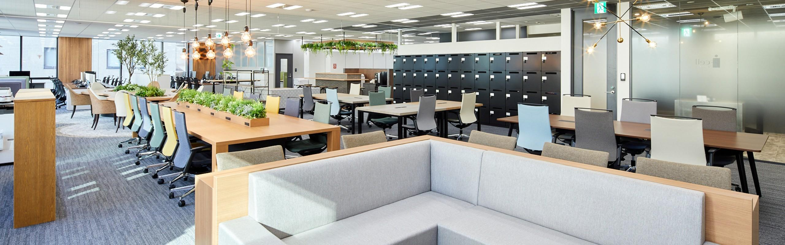2020年8月に完成したばかりの新しいビルにオフィスを構える当社。フリーアドレス席を多く導入し、カフェをイメージしたオシャレな空間です。