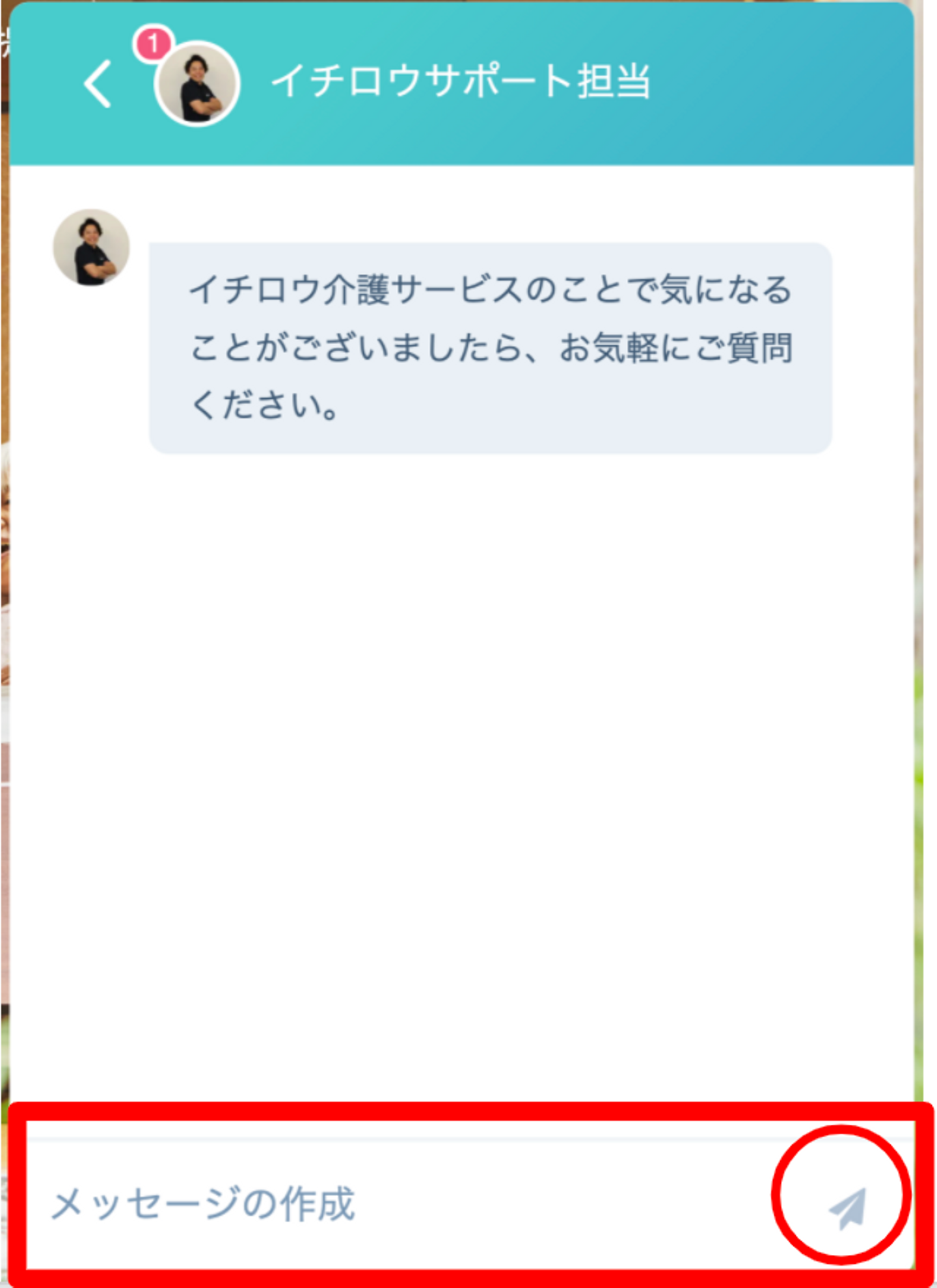 「メッセージの作成」という箇所にご質問内容を記入いただき、右側の紙飛行機ボタンを押すだけ♪