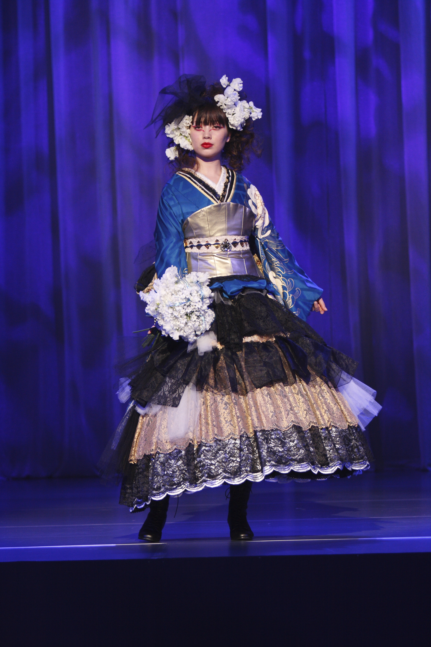 火事で店舗が全焼してから、新店舗がオープンして5年経った頃、オリジナルの着物のコレクションがかなり溜まってきたので、和装のショーをすることにした。オリジナル和装コレクションを中心に、新生ブライダルコア伊谷が進むべき方向性を、お客様と、社員の皆さんへショー形式のメッセージイベントとしてプレゼンテーションするという企画。着物でできるありとあらゆるコーディネートを試すことにして、その中の一つに、個人的には、着物+パニエって、それなりにかっこいいと思うのだが、果たしてそんなことをして、下手をすると、チープな仕上げりで学芸会的な素人芸と取られたら、大失敗になるかもしれないと、眠れないほどの恐怖に襲われた、演出家に真剣に相談しても、「ええんちゃう?」と軽いノリの答えしかなく、実際のところ、夜も眠れないほど恐ろしかった藻を覚えています。