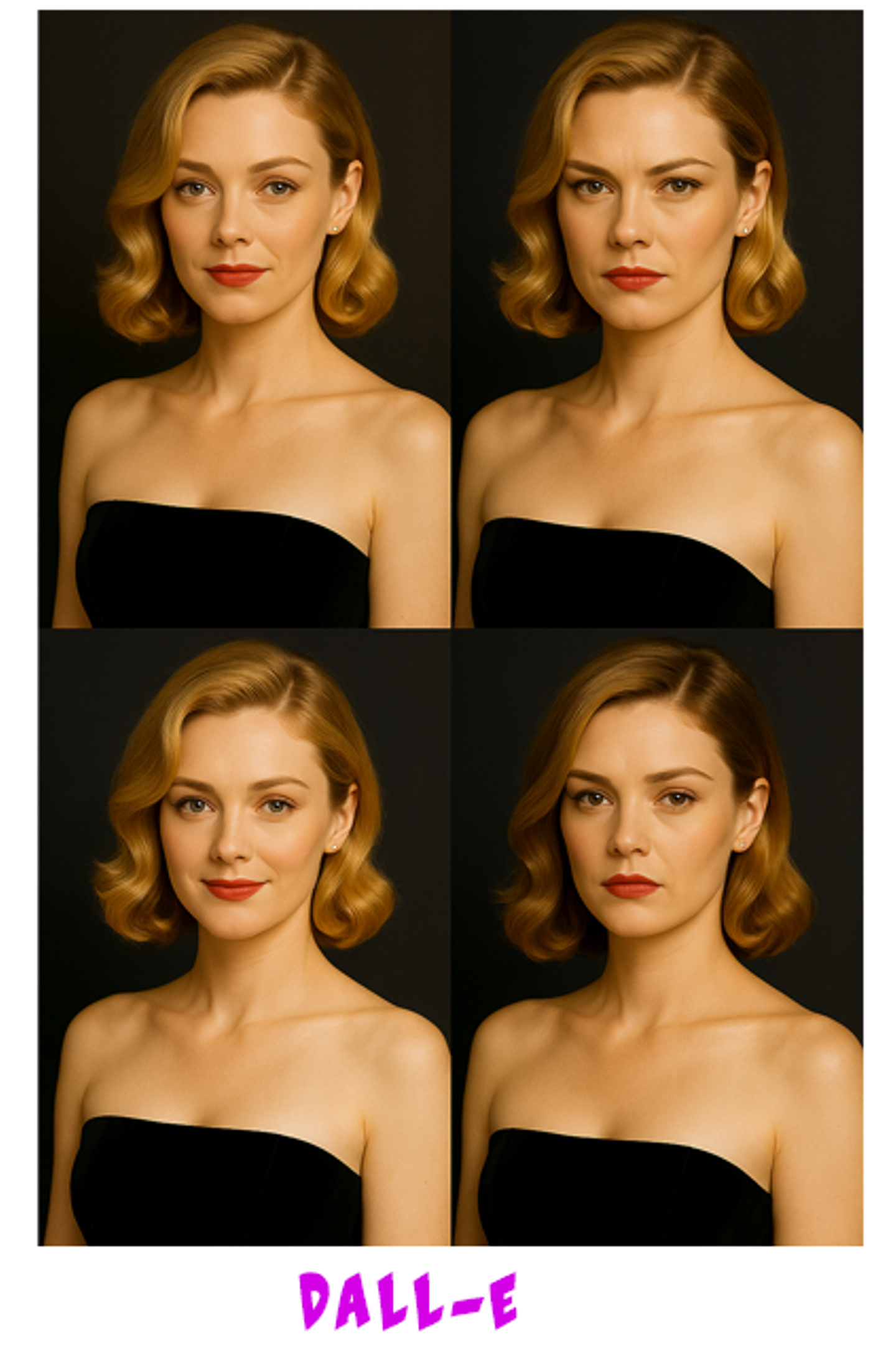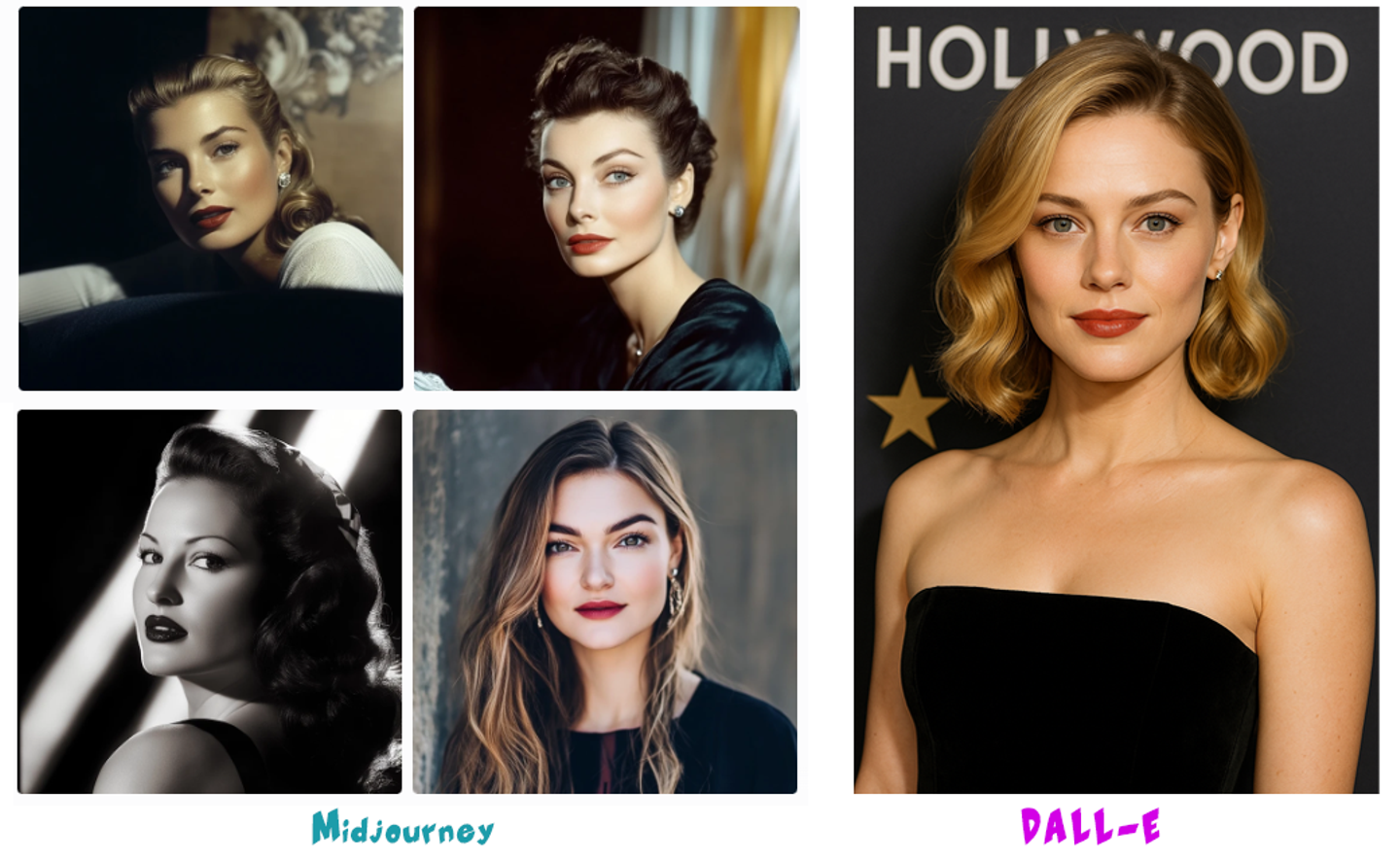 Midjourneyはそのうち3枚がクラシック映画風の女優を描いたようなものでした。