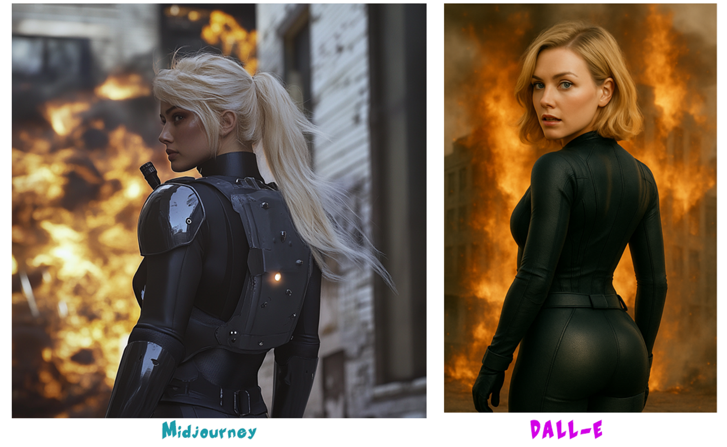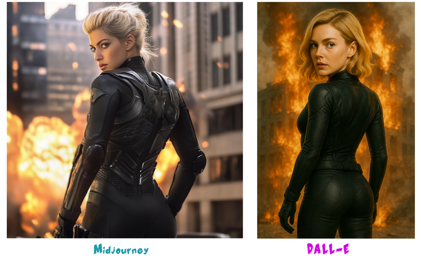 ブロンドの髪にぴったりしたライダースーツを着ており、背景にはビルの爆発シーン。