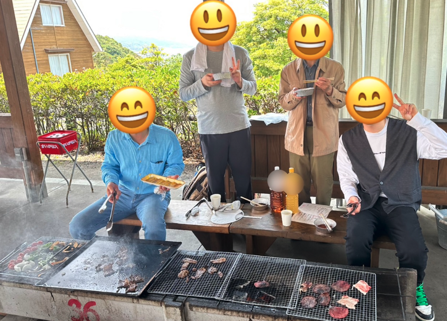 海の見える開放感たっぷりのバーベキューハウスで、みんなで火を囲みながら楽しく食事しました。