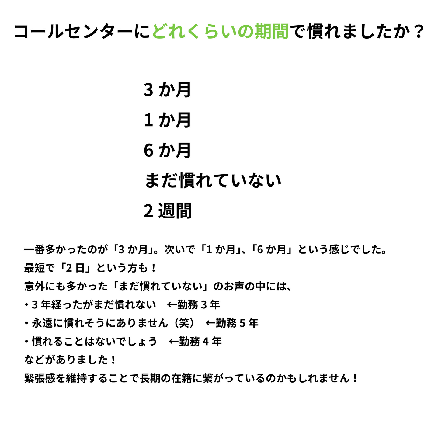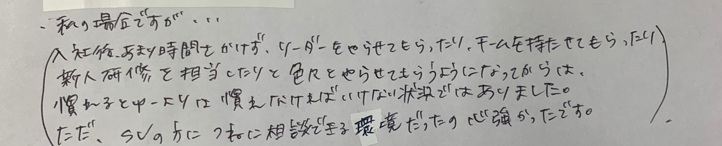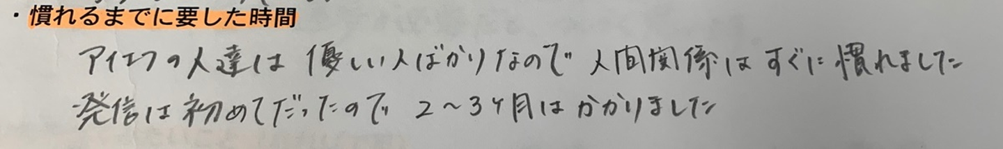 お声の中には「3年前は研修体制があまりなく半年かかったが、研修体制があれば2~3か月で慣れたはず」というものもありました。