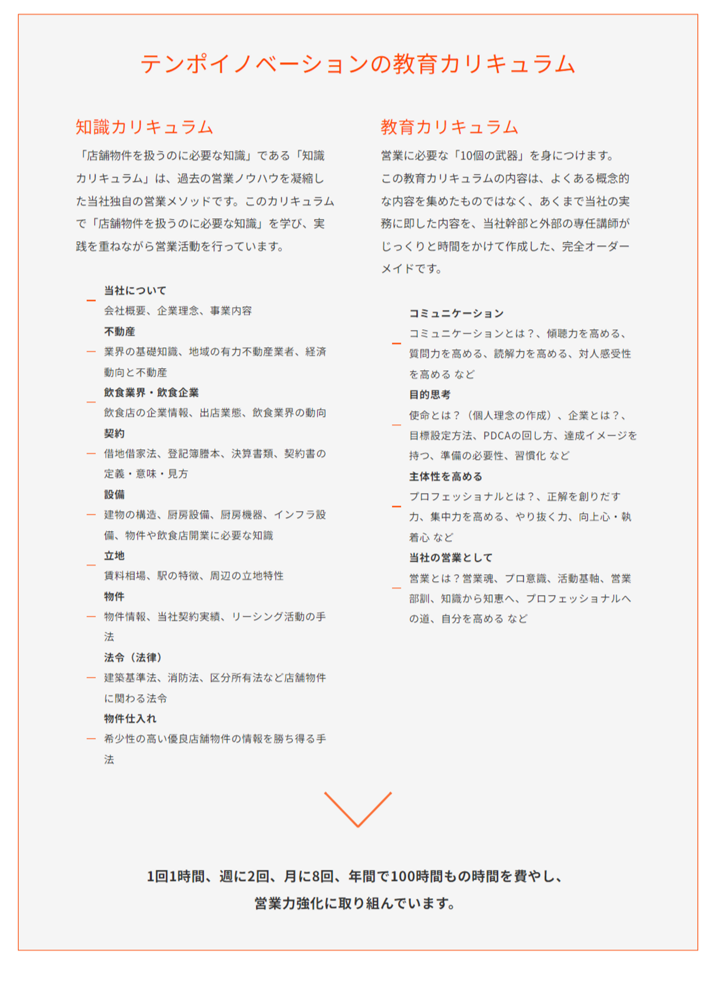 テンポイノベーションでは、ビジネスマンとしての基礎を習得する「教育カリキュラム」と、店舗専門不動産業者としての「知識カリキュラム」をメインに研修を実施しています。