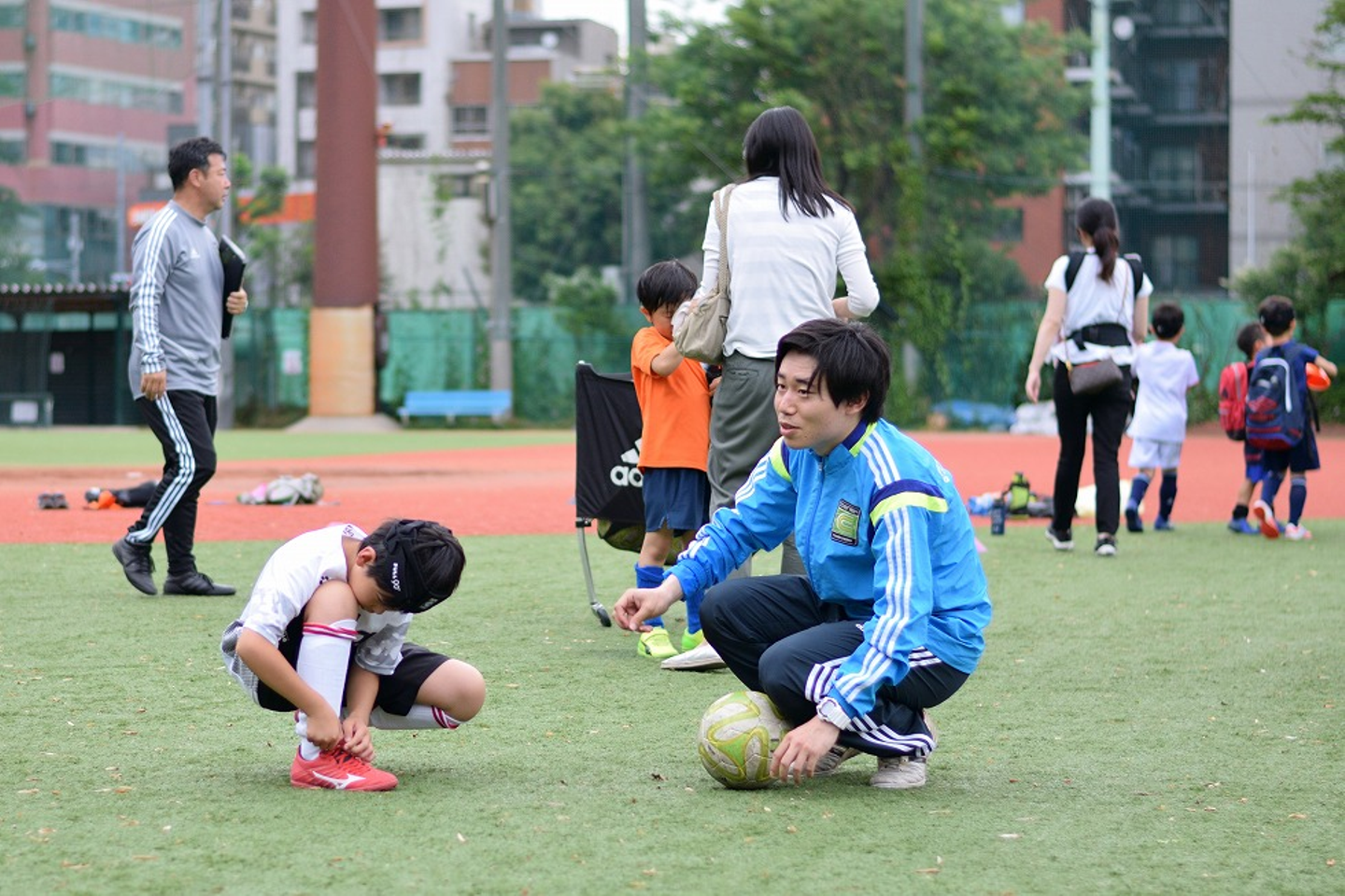 人数あわせで、ミニゲームに入ることもあります。子どもが得点をあげて「サッカーたのしい」と思ってもらえるよう、必要であれば、シュートをお膳立てするパスをすることもあります。いいプレーをして、「うまくなったなあ」と実感してもらえるよう、相手からのプレッシャーがない状況をつくり、練習したテクニックを出しやすい状況でボールを持たせることもあります。たんにプレーするのとは、ちがいます。