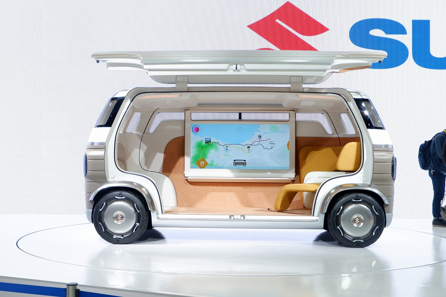 スズキのブースに展示されていたハナレ、これは本気で欲しいと心から思いました。特徴は完全自動運転であることですが、それに加えて、車内の大画面モニターで移動中でもゲームや映画を楽しめるというところです。さらに前後対称のデザインで前後の入れ替わり走行が可能という便利すぎる特徴もあります。ドライバーは常に運転に集中している為、同乗者と顔を合わせて会話ができないですよね。しかしハナレは、皆で向かい合ってコミュニケーションを楽しむことができます。遊び心満載のこの車をとても気に入りました。