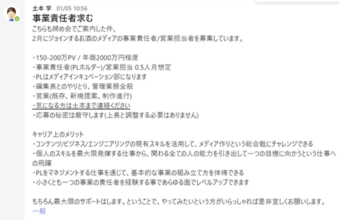 そんなイードに、2/1に新たに仲間入りしたお酒のメディア「nomooo」。nomoooがイードに加わる前に、社内ではこんな投稿がメディア事業本部長の土本からなされました。